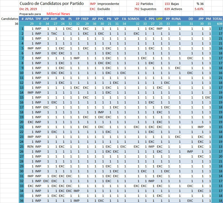 El la siguiente tabla, actualizada a inicio de año 2020, cabe notar que el partido con más exclusiones ha sido el Perú Nación (PN) y se presenta con sólo 21 candidatos. El partido Todos por el Perú ha sido completamente excluido, marcado como improcedente su inscripción. Acción Popular es el único partido que se presenta con todos sus 36 candidatos.
